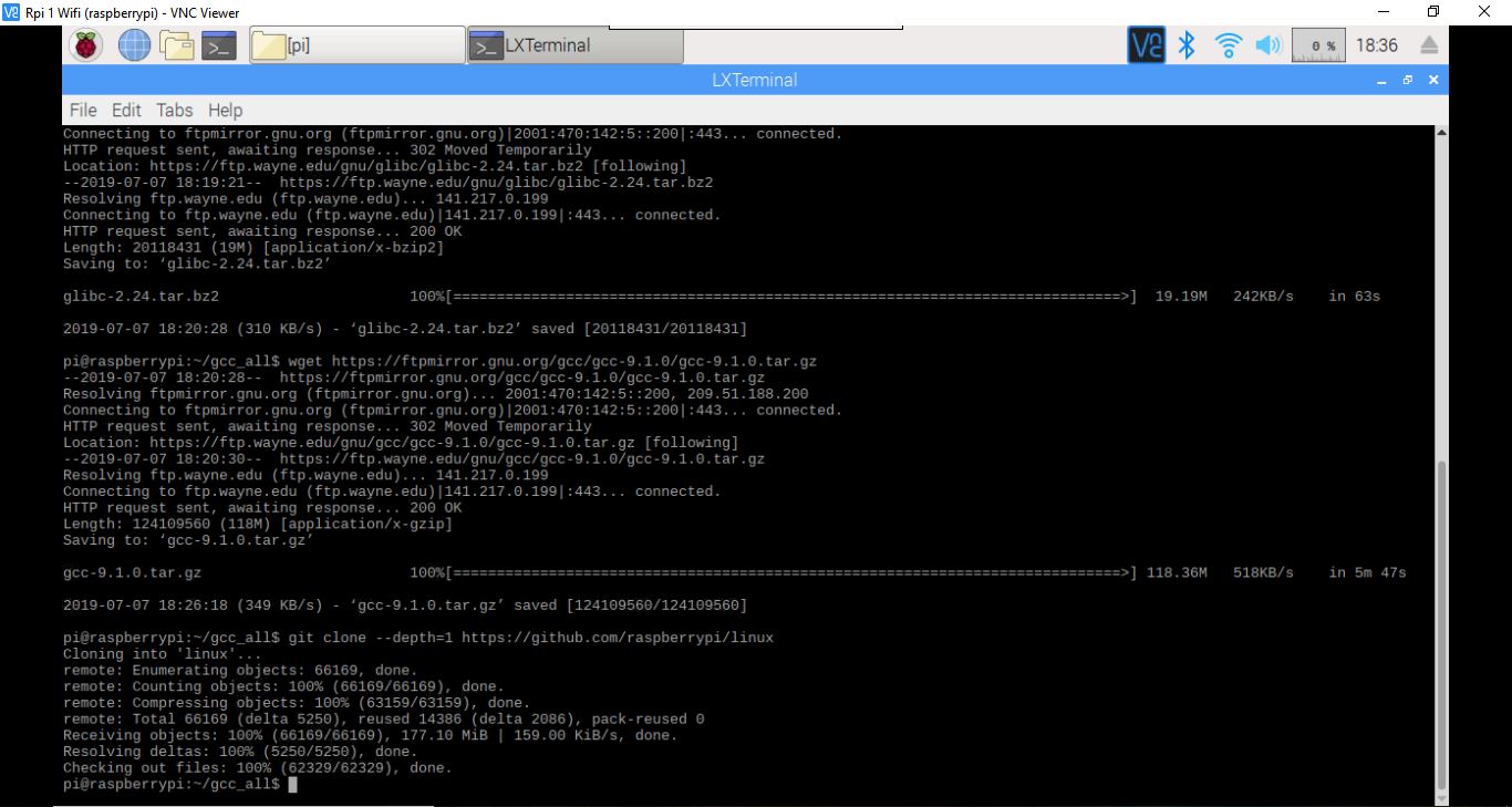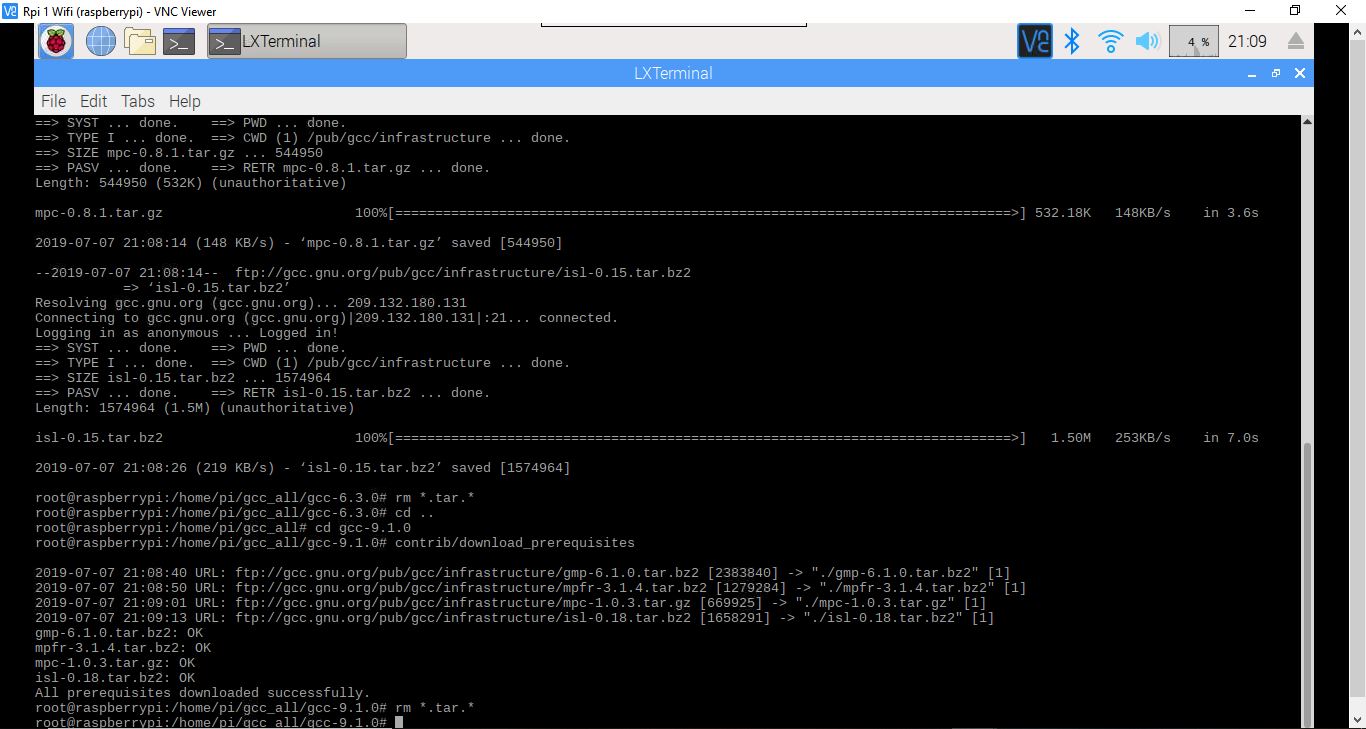 As a side note, building GCC 9.1 with the above cross compiler took about 15 minutes on a Debian 9 x86-64 machine. Compare this with the 5 hours I needed to build GCC 8.1 directly on my Pi 3 in the past and you will see the advantage of having a cross compiler on your main machine. Someone told me that compiling GCC 7 on a Raspberry Pi Zero took about 5 days!