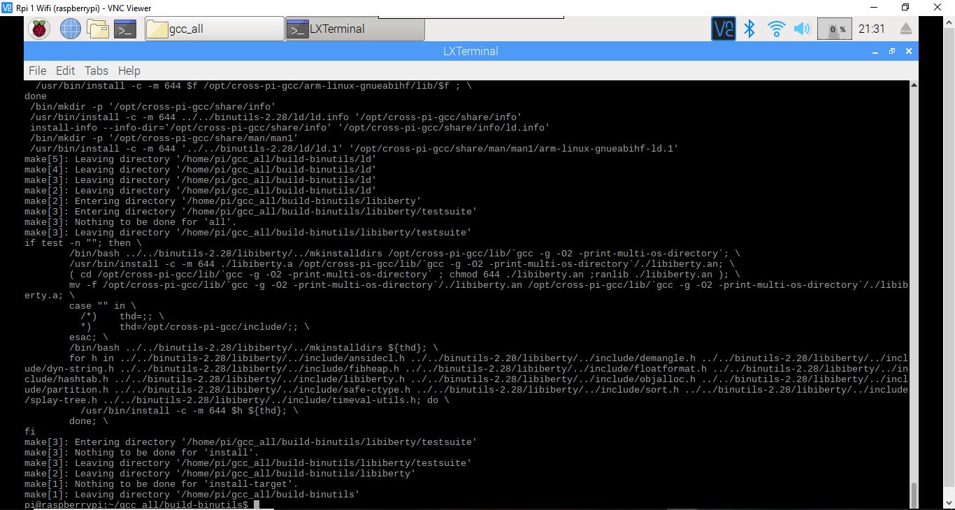 At this point, you can use GCC 9.1 to cross compile any C, C++ or Fortran code for your Raspberry Pi. You can invoke any of the cross compilers by using the prefix: